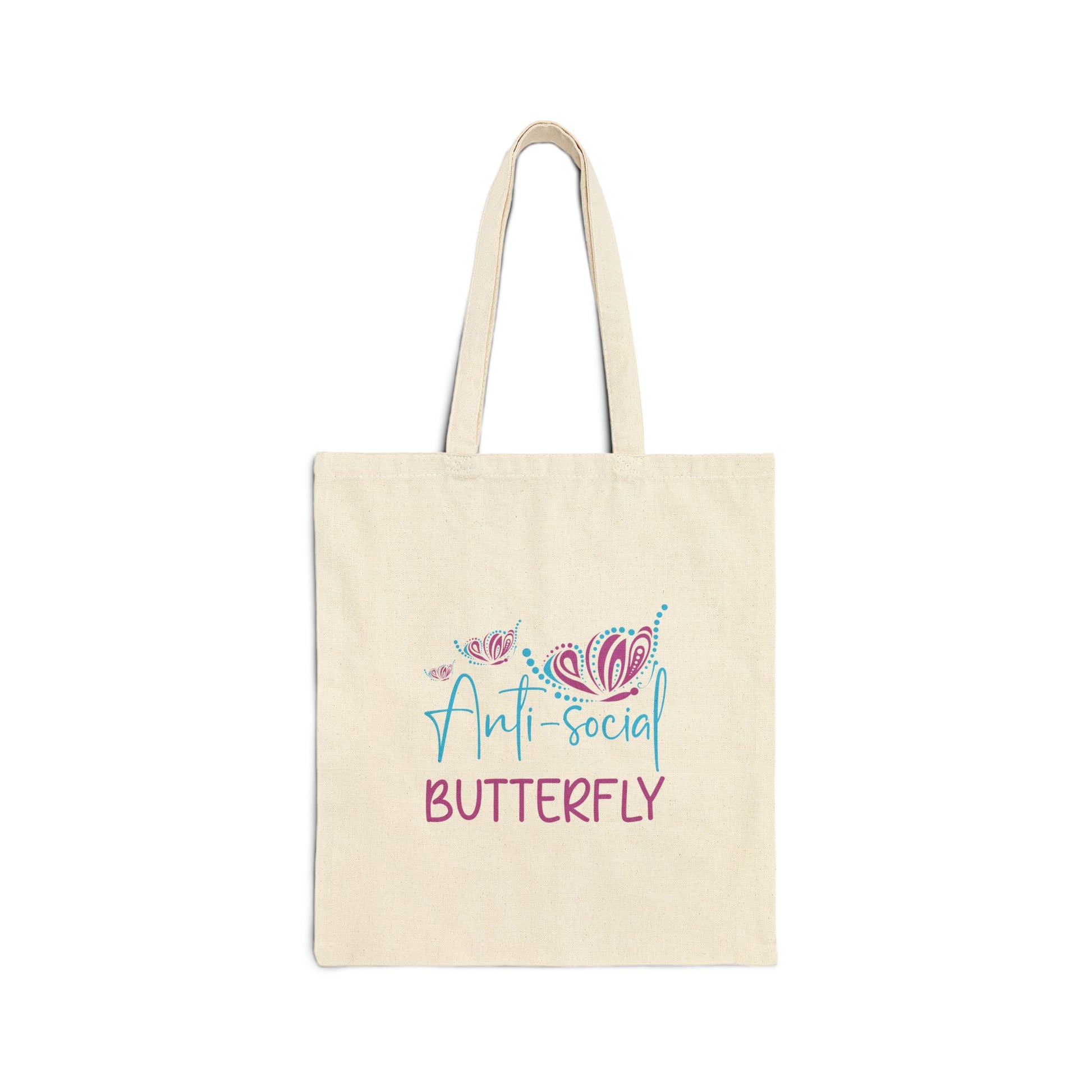 Your new favorite tote. Made from sturdy cotton canvas, it features a charming pastel butterfly and "Anti-Social Butterfly" lettering that celebrates your love of quiet moments. Spacious enough for books and groceries, comfortable to carry, and packed with subtle introvert humor.